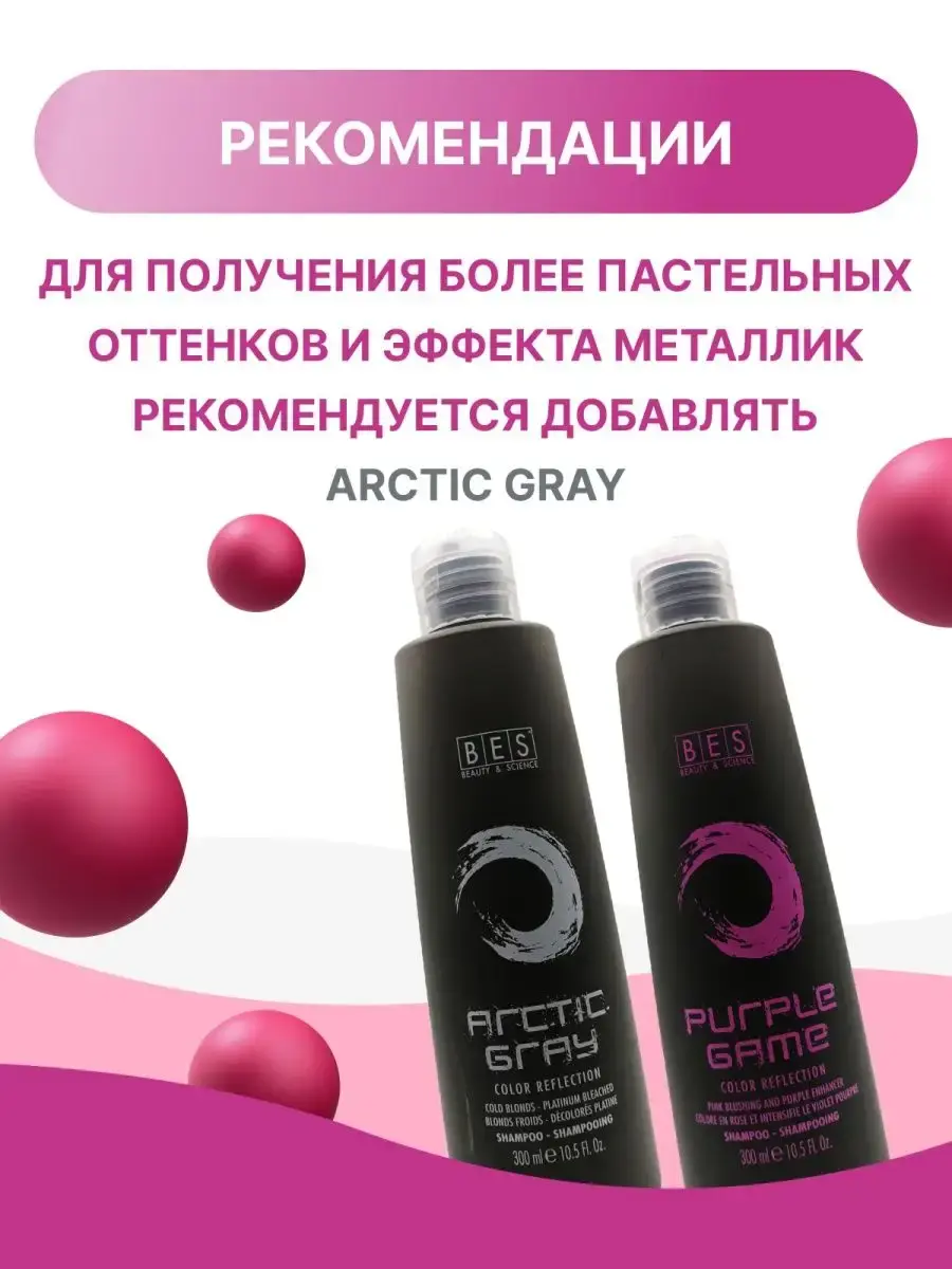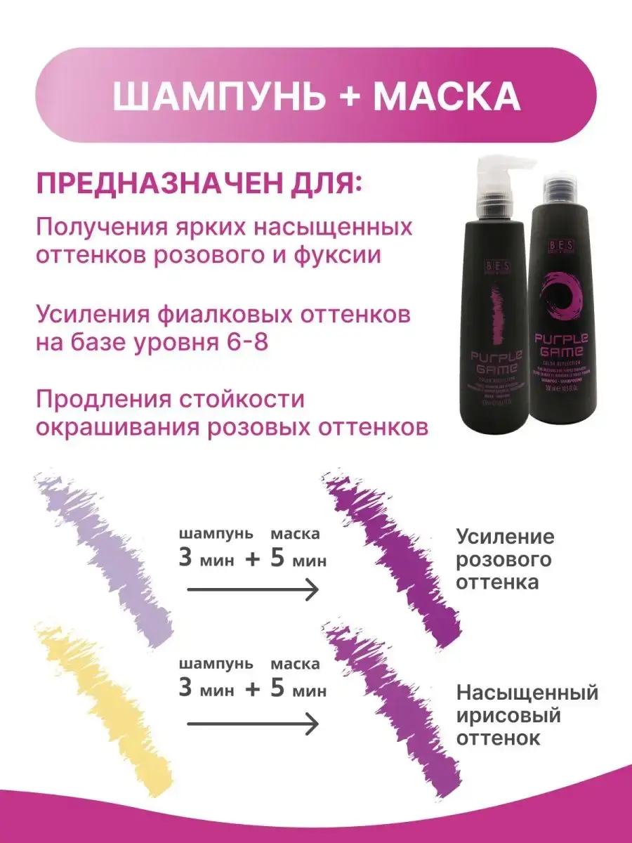Оттеночный шампунь «Purple Game» Color Reflection, BES используется для нейтрализации желтых оттенков и создания розовых оттенков. Позволяет создавать или поддерживать розовые, жемчужные или пурпурные оттенки на ваших волосах. Повышает насыщенность всех оттенков розово-фиолетового направления от темного до самого светлого (в зависимости от времени выдержки).