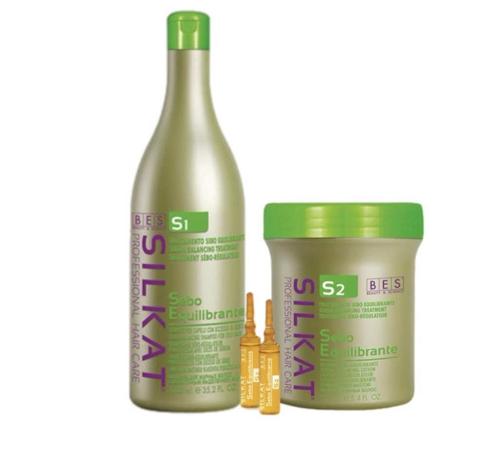 Набор против жирности волос Silkat Sebo Equilibrante BES (Шампунь S1, 1 л + Лосьон S 2, 12 ампул х 10 мл):