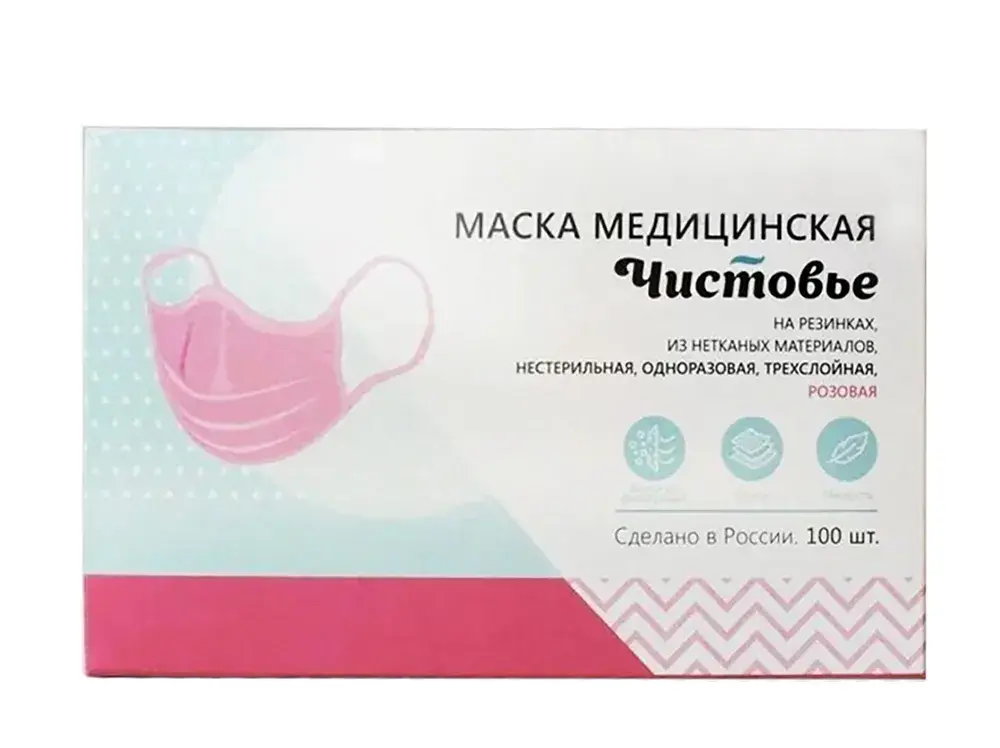 Маска трехслойная на резинке (розовая), медицинская, Чистовье: