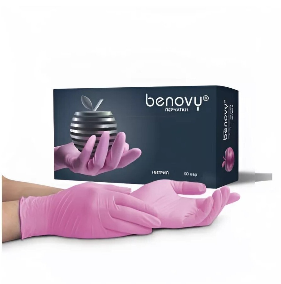 Нитриловые перчатки неопудренные текстурированные на пальцах розовые, Benovy: