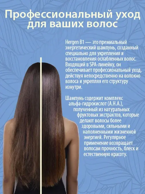 Шампунь Hergen Blue, BES, B1 с комплексом фруктовых кислот для глубокого восстановления поврежденных, ослабленных и окрашенных волос. Укрепляет структуру волокна, возвращает жизненную силу и защищает от внешних воздействий.