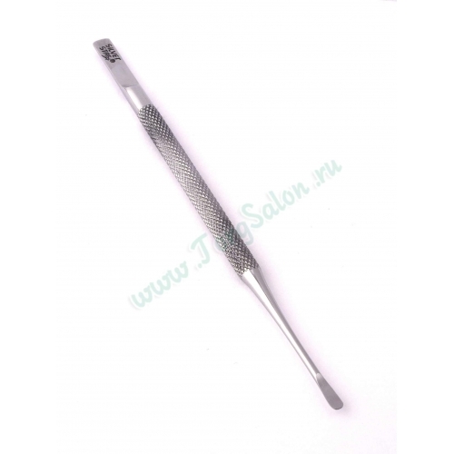 Двухсторонний инструмент для маникюра, предназначенный для эффективной работы с кутикулой и излишками кожного покрова около ногтевой пластины. С одной стороны у изделия расположена аккуратная плоская лопаточка, а с другой - круглая.